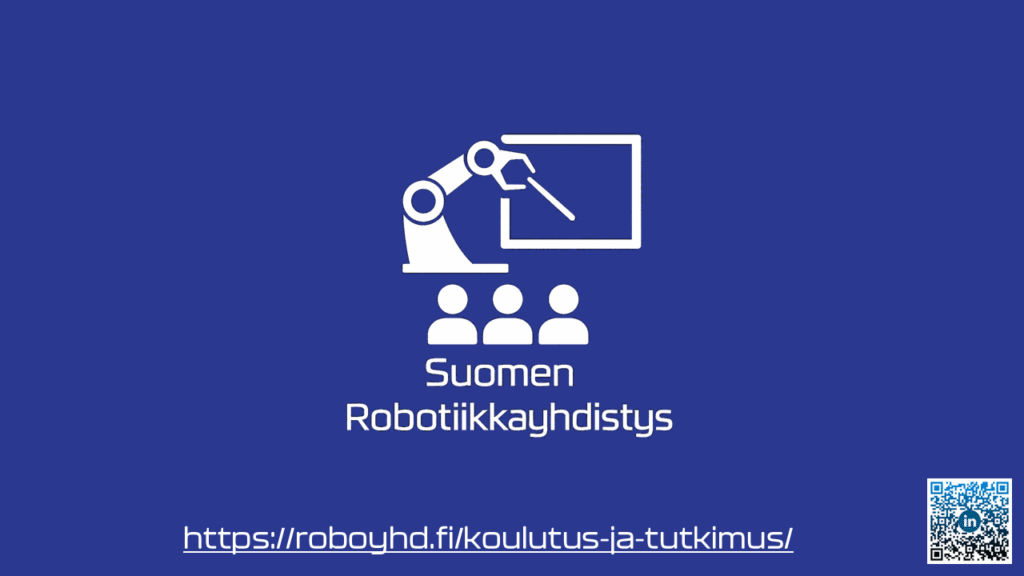 Jatkuvan oppimisen ja työllisyyden palvelukeskuksen rahoittamat teollisuusrobotiikan koulutukset ovat alkaneet ympäri Suomen. Kahdeksan hankkeen toimijat kokoontuivat Tampereella joulukuussa 2025 tutustumaan toisiinsa ja jakamaan parhaita käytäntöjä. Päivän aikana löydettiin useita eri mahdollisuuksia yhteistyöhön, joka mahdollistaa entistä laajemman ja laadukkaamman opetusmateriaalin tuottamisen teollisuusrobotiikkaa kouluttavien tahojen tarpeisiin. Lisää tietoa koulutuksista alla olevissa kalvoissa ja yhdistyksen sivulla https://roboyhd.fi/koulutus-ja-tutkimus/
